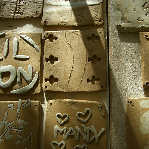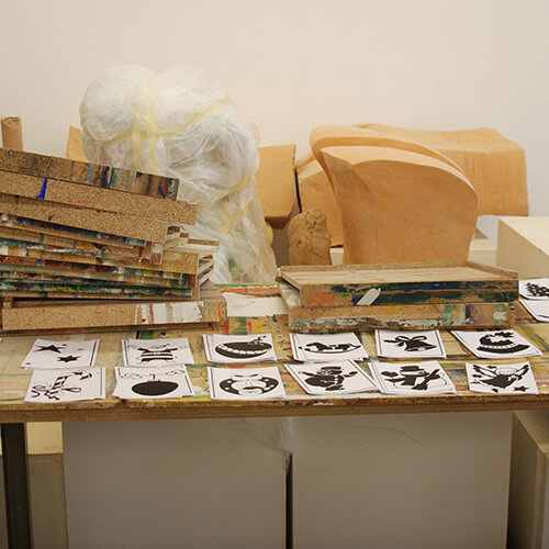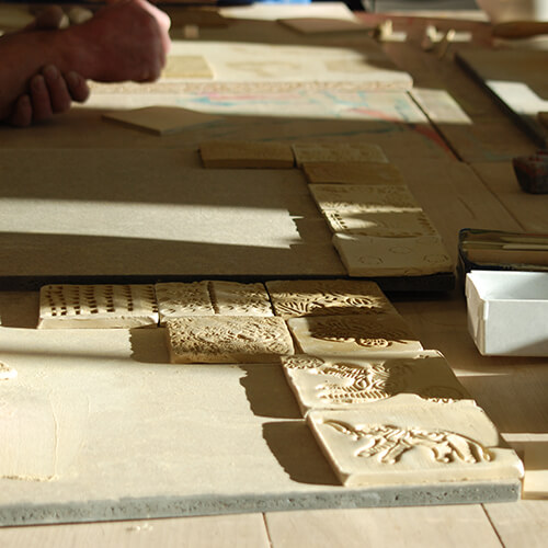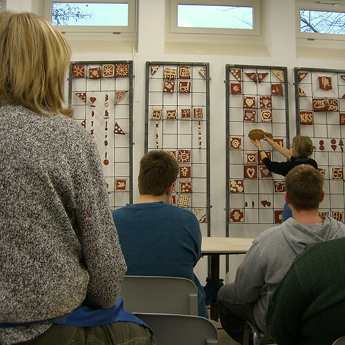 So arbeiteten über einen Zeitraum von 2 Jahren insgesamt 8 Teilnehmer:innen aus Werkstätten für behinderte Menschen einmal wöchentlich in verschiedenen Bereichen in der Werkschule. Sie produzierten individuelle Druckerzeugnisse, keramische Arbeiten und Einzelstücke – von der Weihnachtskarte über Blumentöpfe, Leuchten, Schalen, Umtöpfen für innen. Außerdem fertigten die Mitarbeiter:innen der WfbM nach Künstlerentwurf per Hand Fliesen, Kacheltische, Kleinplastiken, Teichinstallationen, Brunnen und vieles mehr.